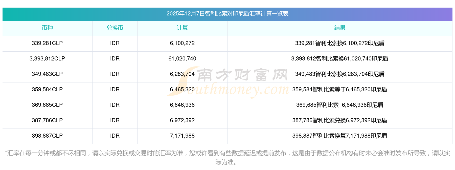 2025年12月7日,货币兑换:1智利比索=17.98印尼盾。如:1智利比索、2智利比索、5智利比索、10智利比索、20智利比索、50智利比索、100智利比索,分别折合印尼盾17.98、35.96、89.9、179.8、359.6、899、1798印尼盾。举例:假如一瓶矿泉水需要1智利比索,则需印尼盾:17.98印尼盾。
