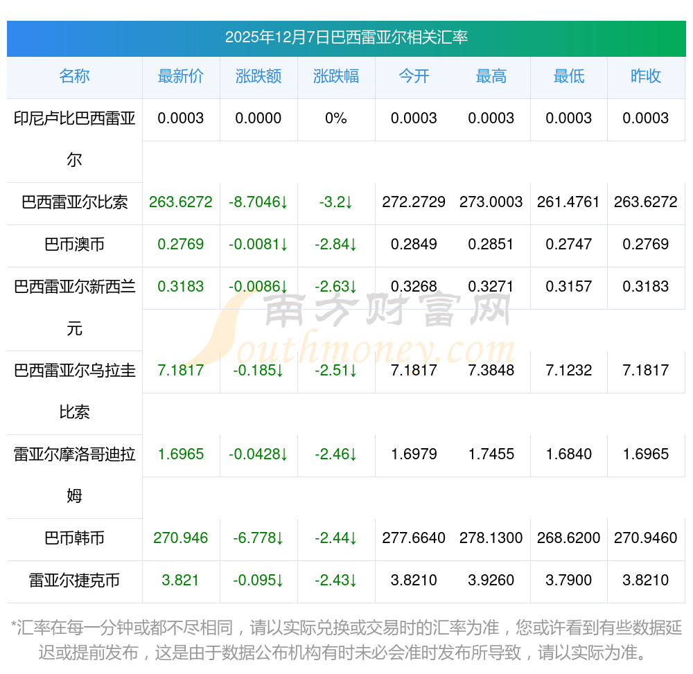 根据2025年12月7日汇率计算,BRL兑换EGP汇率最新价8.735700,今开价8.7453,昨收价8.7453,最高价8.9811,最低价8.6740。