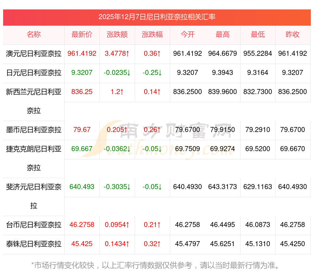 2025年12月7日尼日利亚奈拉相关汇率查询