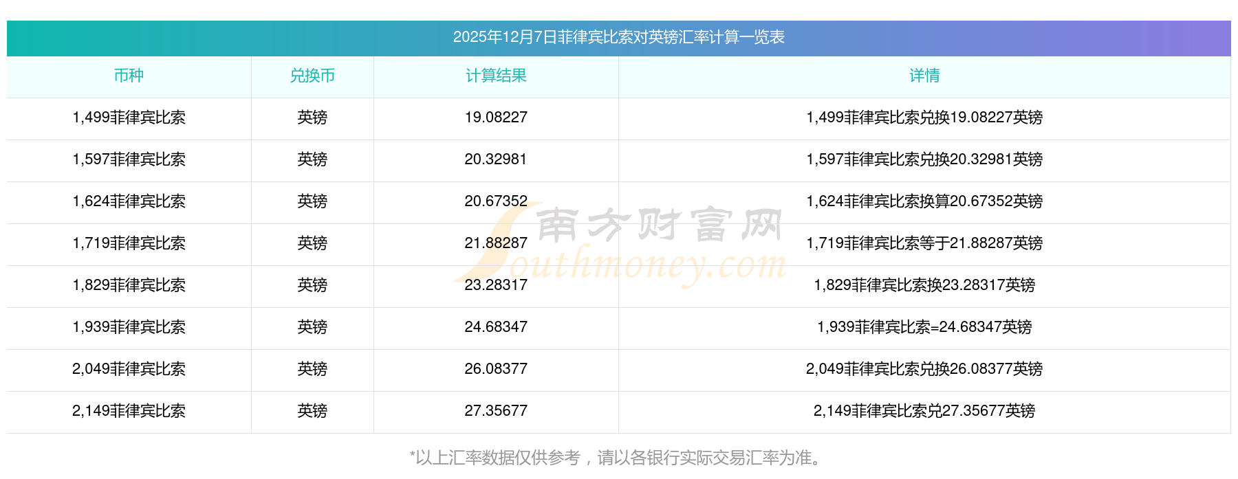 17菲律宾比索今天折算英镑汇率查询方法2025/12/7