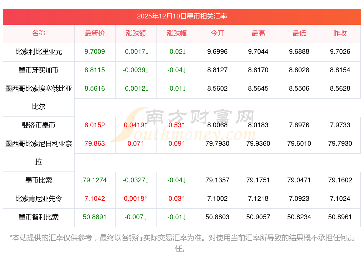 根据2025年12月10日汇率计算,MXN兑换MAD汇率最新价0.508300:今日开价0.5088,昨日收价0.5088,最高价0.5088,最低价0.5071。