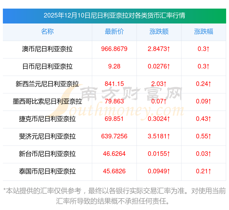 2025年12月10日尼日利亚奈拉相关汇率查询