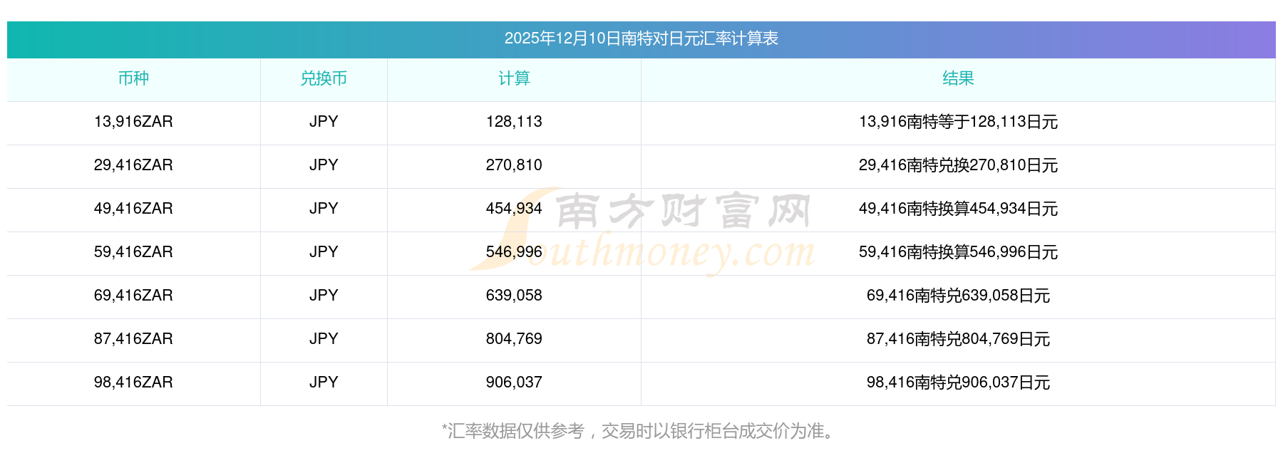 南非兰特12月10日汇率:南非兰特对日元汇率多少?
