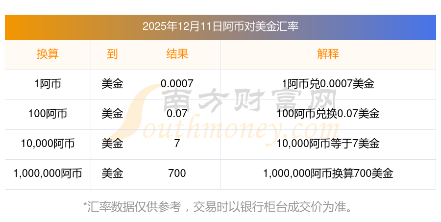 南方财富网为您提供阿币对美金汇率最新价格详情。