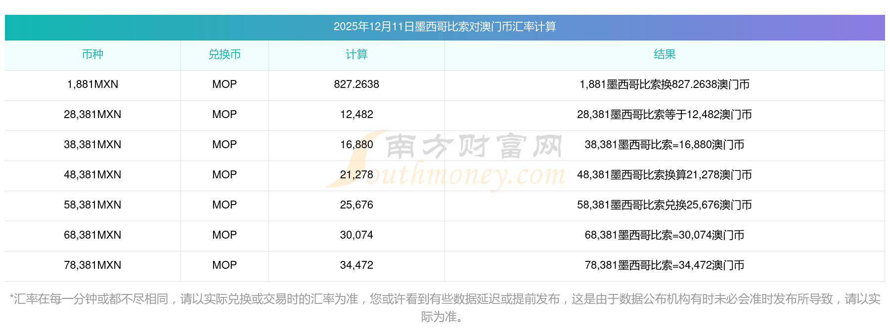南方财富网为您提供墨西哥比索对澳门币汇率最新价格详情。