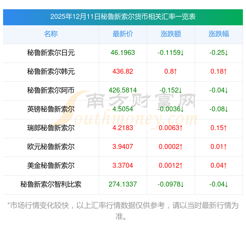 每日汇率_用秘鲁新索尔对韩元汇率表查询2025年12月11日