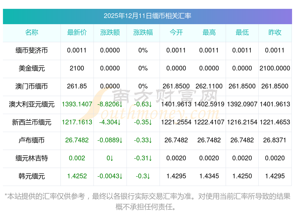 根据2025年12月11日汇率计算,MMK兑换ZAR汇率最新价0.008080:
