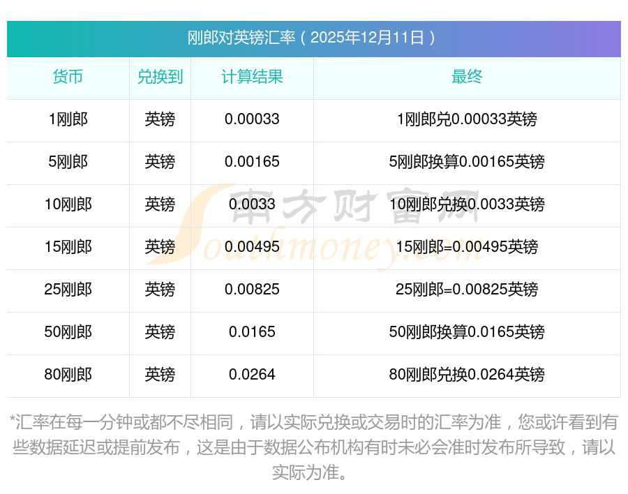 南方财富网为您提供刚郎对英镑汇率最新价格详情。