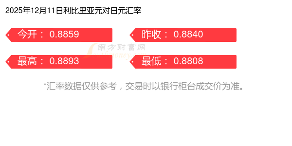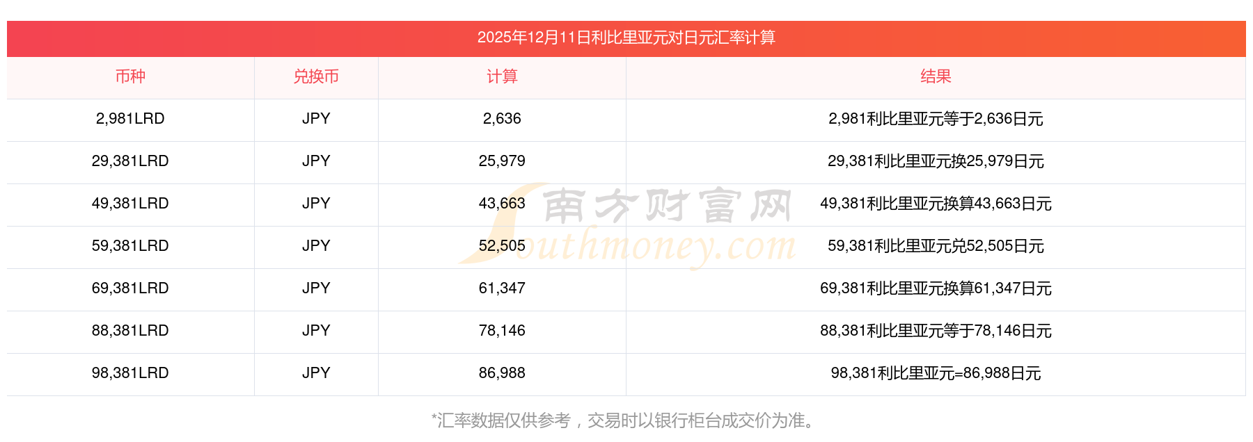 今日利比里亚元汇价:2025年12月11日18利比里亚元兑日元汇价一览表