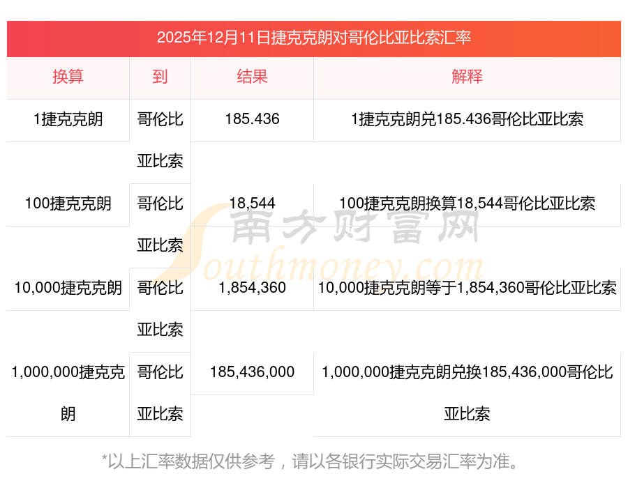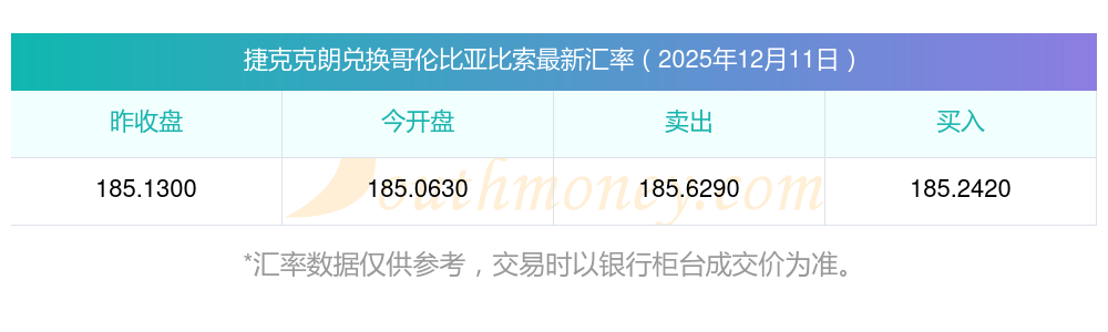 捷克克朗今日汇价表:2025年12月11日4捷克克朗兑哥伦比亚比索汇价多少