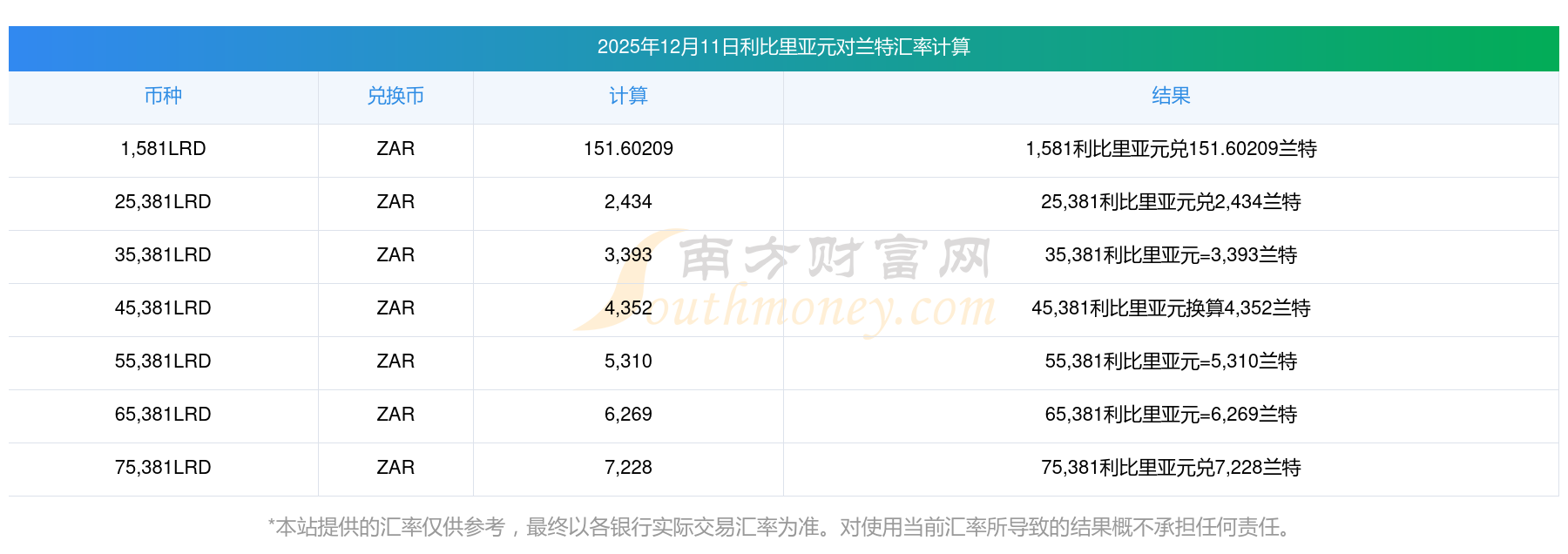南方财富网为您提供利比里亚元对兰特汇率最新价格详情。