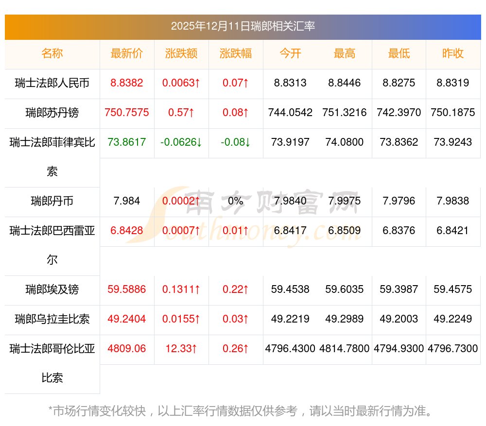 汇率新调整 14瑞郎兑换苏丹镑汇率行情? 2025年12月11日
