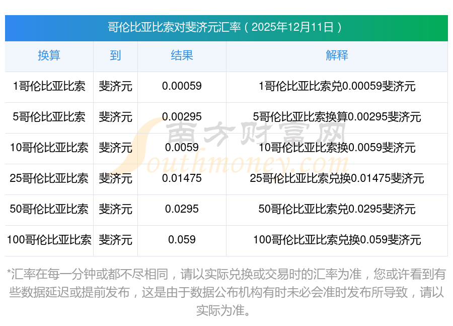 2025年12月11日哥伦比亚比索兑换斐济元汇率是:0.00059