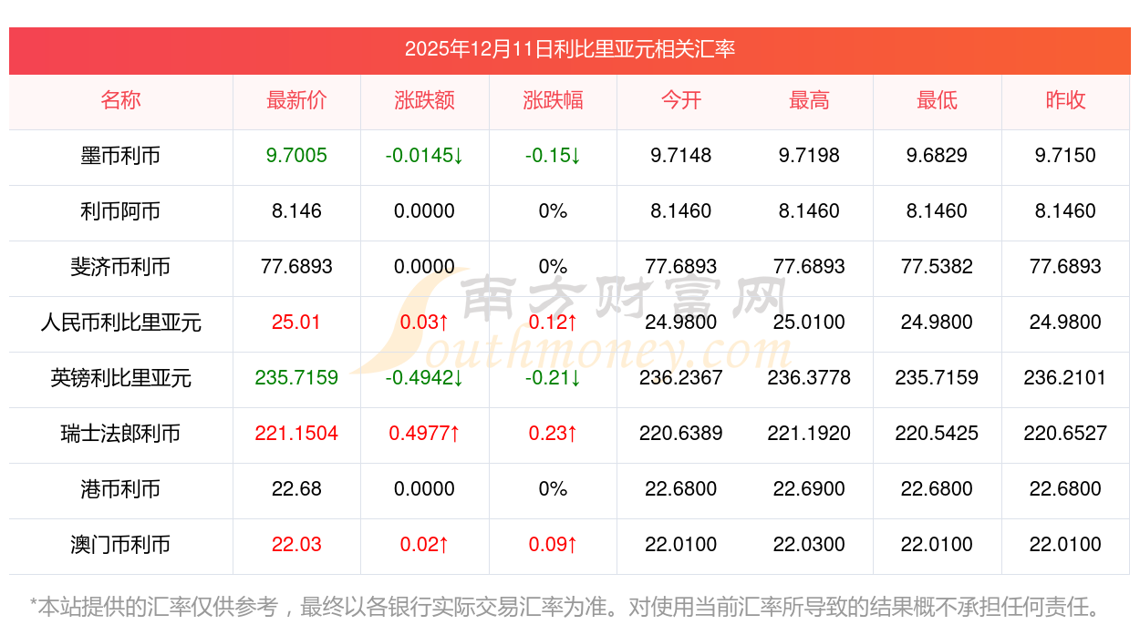 根据2025年12月11日汇率,利比里亚元兑换雷亚尔汇率最新价0.031000,今开价0.0310,昨收价0.0310,最高价0.0310,最低价0.0310。