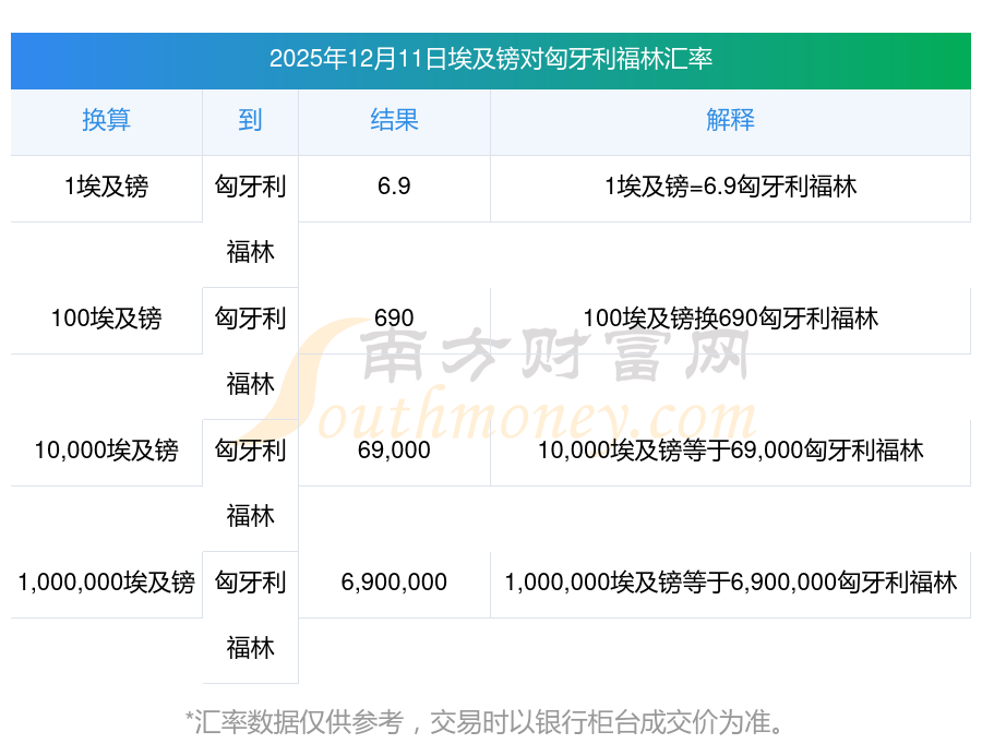 2025年12月11日今天汇率,换算埃及镑(EGP)到匈牙利福林(HUF):1埃及镑等于6.9匈牙利福林