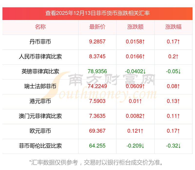 根据2025年12月13日汇率计算,菲币兑换比索汇率最新价0.304800,今开价0.3061,昨收价0.3061,最高价0.3063,最低价0.3046。