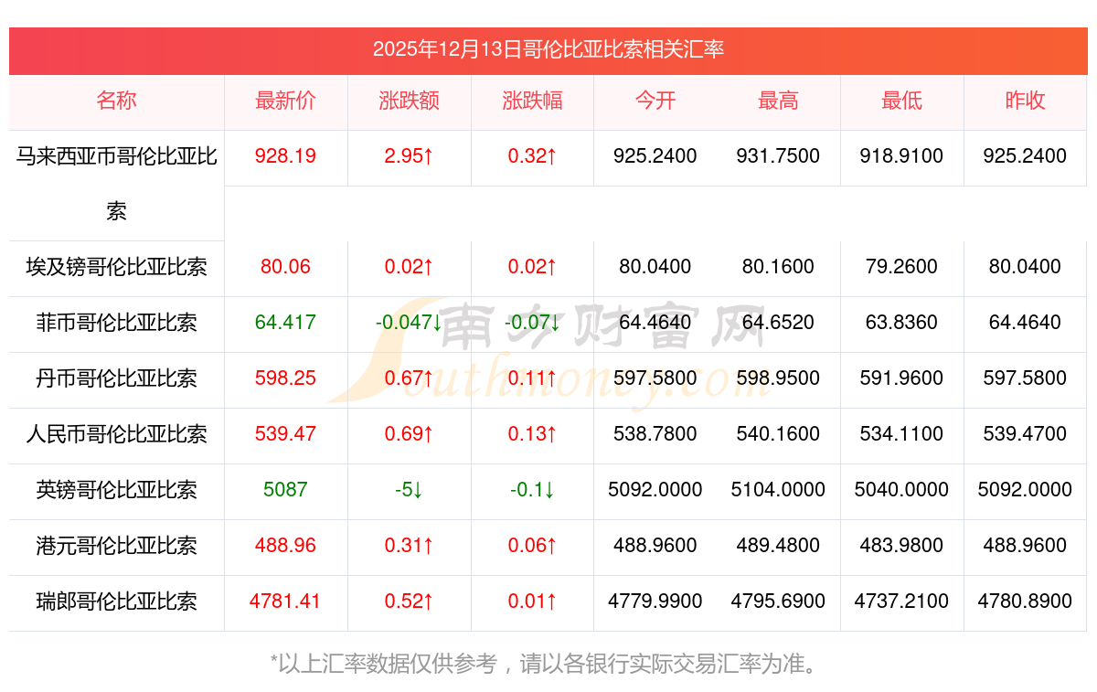 根据2025年12月13日汇率计算,COP兑换CLP汇率最新价0.239200:今开价0.2404,昨收价0.2392,最高价0.2420,最低价0.2390。