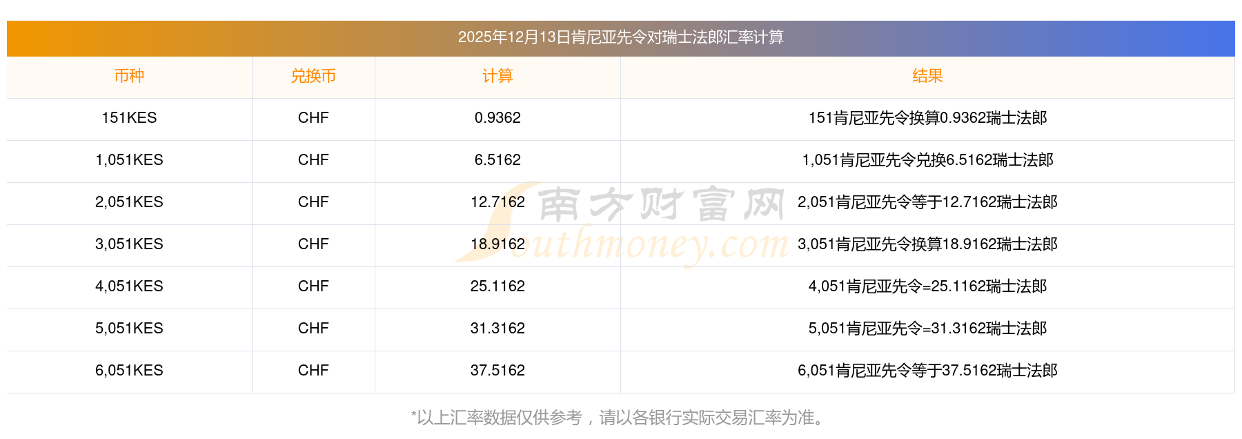 2025年12月13日肯尼亚先令与瑞士法郎的兑换汇率计算如下: