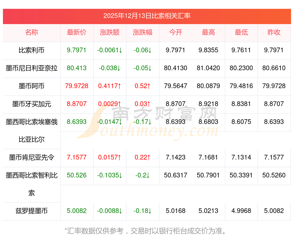 根据2025年12月13日汇率计算,MXN兑换COP汇率最新价211.263000:今开价210.6250,昨收价211.2630,最高价211.5770,最低价208.9020。