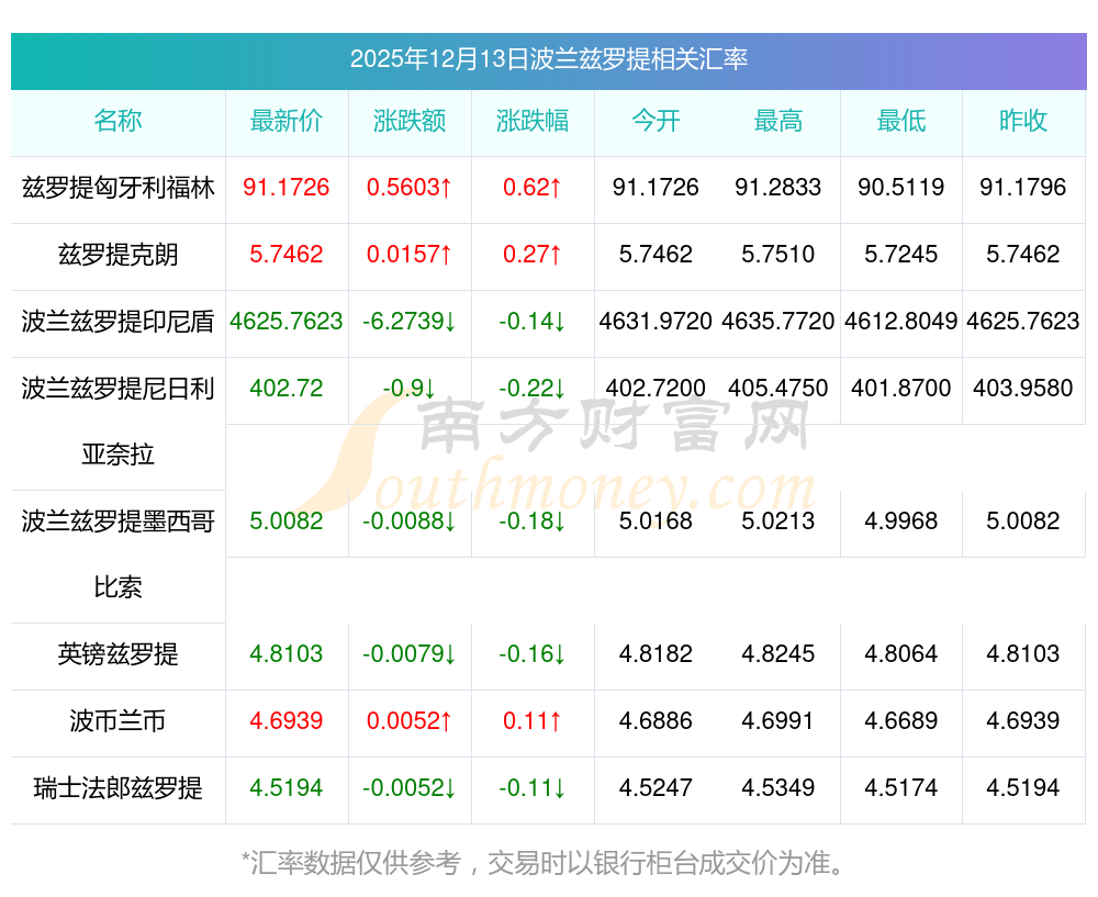 根据2025年12月13日汇率计算,PLN兑换NGN汇率最新价402.720000,今开价402.7200,昨收价403.9580,最高价405.4750,最低价401.8700。