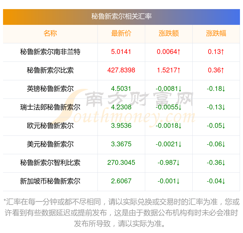 南方财富网为您提供秘鲁新索尔对比索汇率最新价格详情。