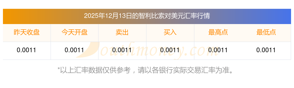 2025年12月13日智利比索兑换美元汇率是:0.0011