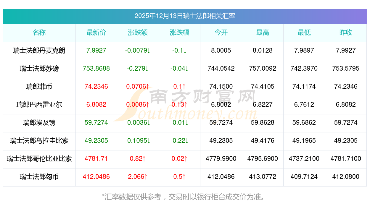 最新今日瑞士法郎兑韩币汇率是多少2025-12-13