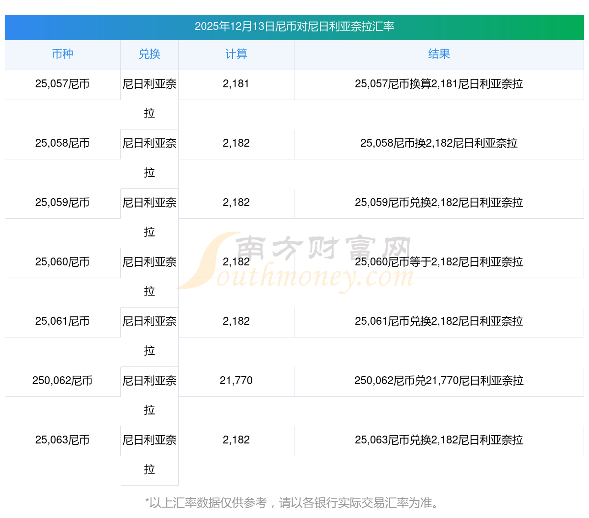 汇率调整新消息:尼币兑尼日利亚奈拉汇率查询表2025/12/13