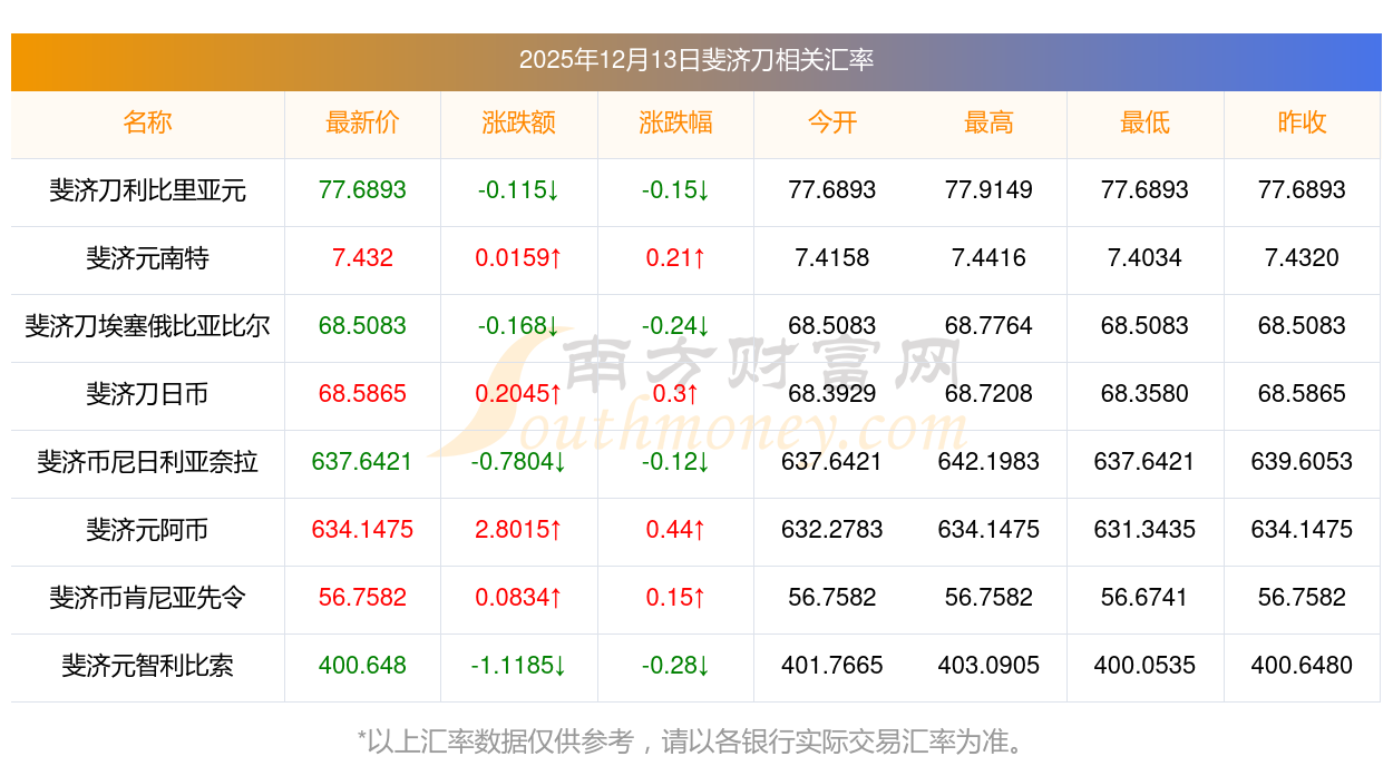 根据2025年12月13日汇率,斐济刀兑换摩洛哥迪拉姆汇率最新4.043300,今开4.0455,昨收4.0453,最高4.0575,最低4.0302。
