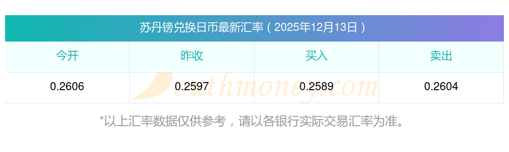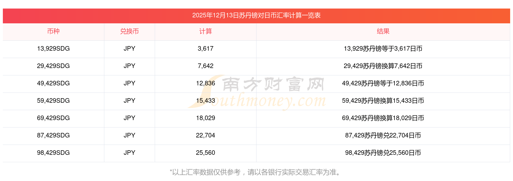 苏丹镑今日汇率行情:10苏丹镑等于多少日元?2025/12/13