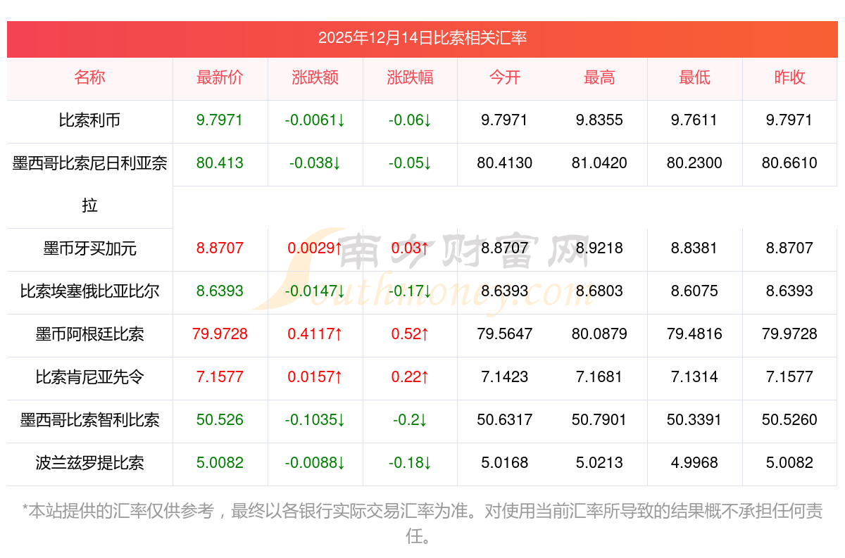根据2025年12月14日汇率计算,比索兑换利币汇率最新价9.797100,今开价9.7971,昨收价9.7971,最高价9.8355,最低价9.7611。