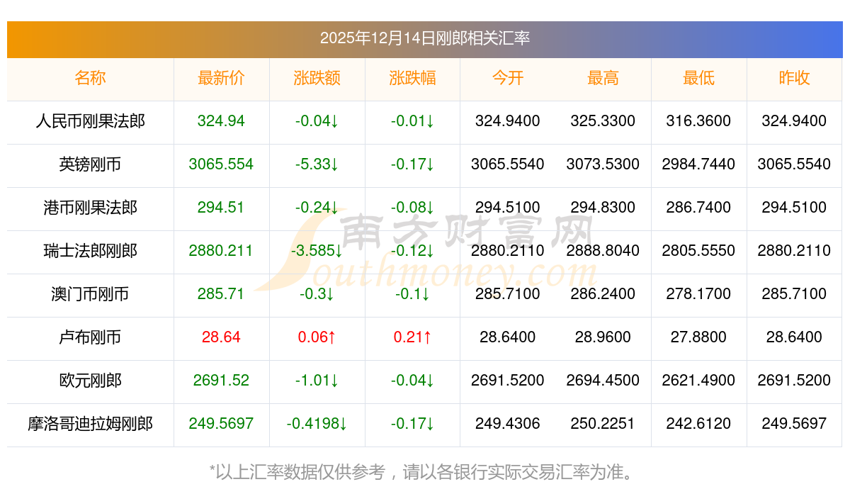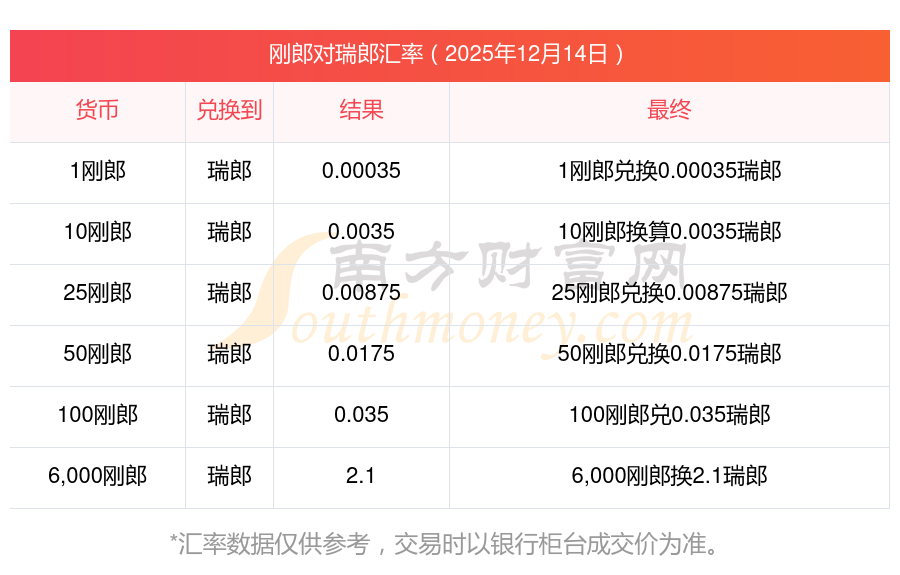 汇率今日价格 今天18刚郎兑换瑞郎是多少钱? 2025年12月14日