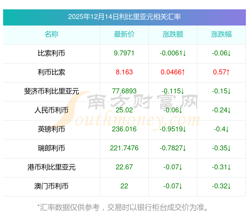 根据2025年12月14日汇率计算,利比里亚元兑换巴西雷亚尔汇率最新价0.030700,今开价0.0307,昨收价0.0307,最高价0.0307,最低价0.0305。