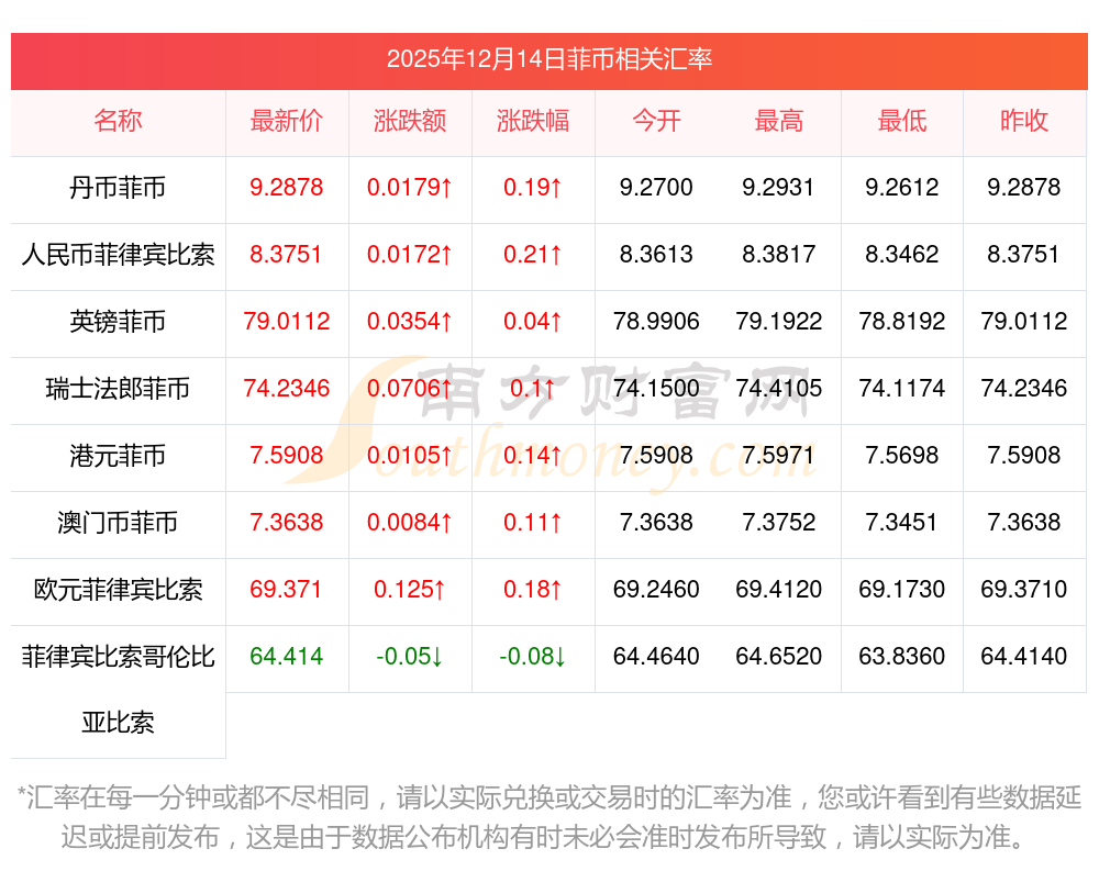 根据2025年12月14日汇率,菲币兑换斐济元汇率最新0.038460,今开0.0385,昨收0.0385,最高0.0386,最低0.0384。