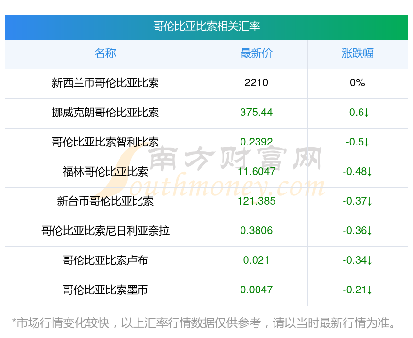 南方财富网为您提供哥伦比亚比索对比索汇率最新价格详情。