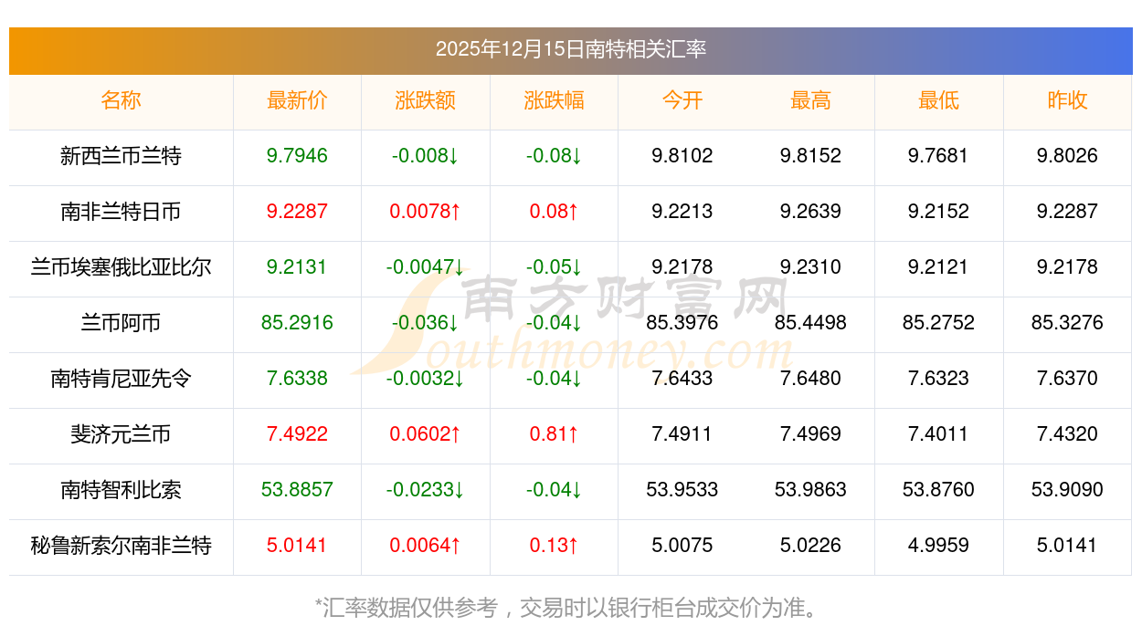 根据2025年12月15日汇率计算,ZAR兑换AUD汇率最新价0.089100,今开价0.0890,昨收价0.0891,最高价0.0893,最低价0.0890。