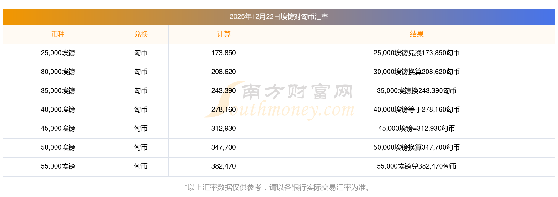 南方财富网为您提供埃镑对匈币汇率最新价格详情。
