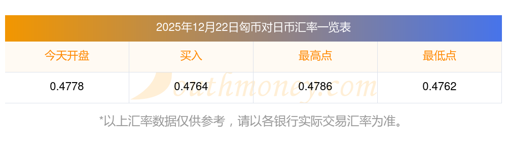 匈牙利福林货币汇率,1匈币等于多少日元?2025-12-22