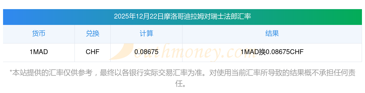 今天汇率更新!2025年12月22日45摩洛哥迪拉姆兑换瑞士法郎是多少?