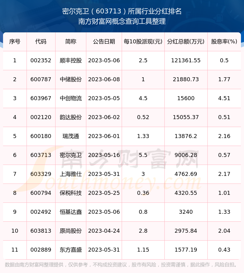 按照南方财富网趋势选股系统统计,密尔克卫所属行业为物流行业行业,物流行业行业分红排名情况如下表: