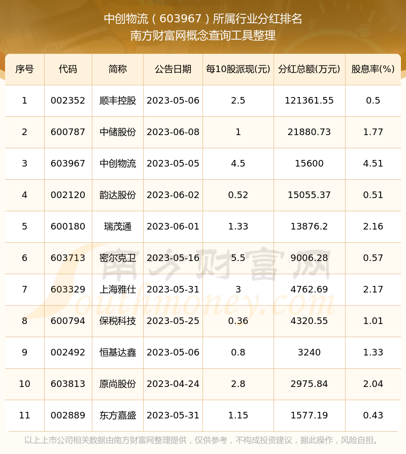 按照南方财富网趋势选股系统统计,中创物流所属行业为物流行业行业,物流行业行业分红排名情况如下表: