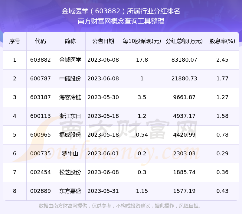 按照南方财富网趋势选股系统统计,金域医学所属行业为医疗服务行业,医疗服务行业分红排名情况如下表:
