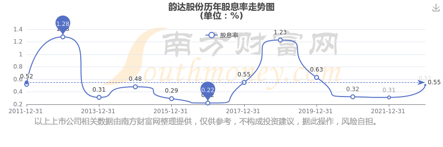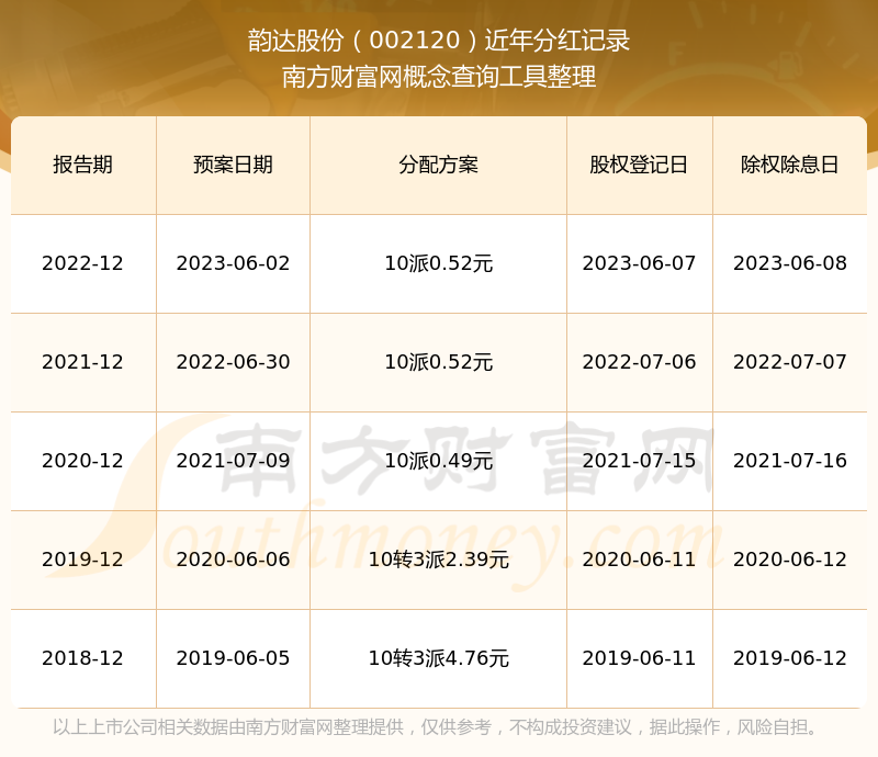 韵达股份最新一次公布的分红方案为10派0.52元。本次权益分派股权登记日为2023年6月7日,除权除息日为2023年6月8日,派息日为2023年6月8日。