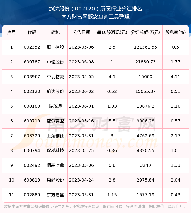 按照南方财富网趋势选股系统统计,韵达股份所属行业为物流行业行业,物流行业行业分红排名情况如下表: