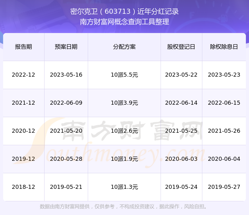 密尔克卫最新一次公布的分红方案为10派5.5元。本次权益分派股权登记日为2023年5月22日,除权除息日为2023年5月23日,派息日为2023年5月23日。