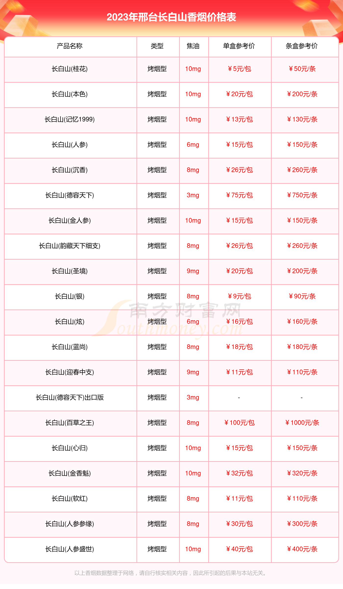 邢台长白山香烟价格多少一包2023价格一览表