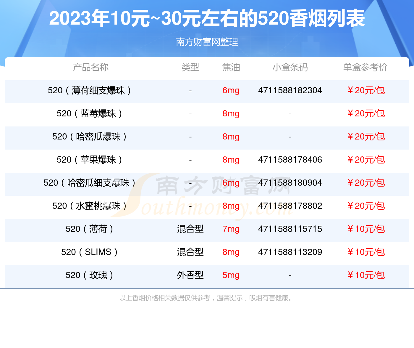 520(薄荷细支爆珠)参考价20元/包、520(蓝莓爆珠)参考价20元/包、520(哈密瓜爆珠)参考价20元/包、520(苹果爆珠)参考价20元/包、520(哈密瓜细支爆珠)参考价20元/包、520(水蜜桃爆珠)参考价20元/包、520(薄荷)参考价10.0元/包、520(SLIMS)参考价10.0元/包、520(玫瑰)参考价10元/包等。