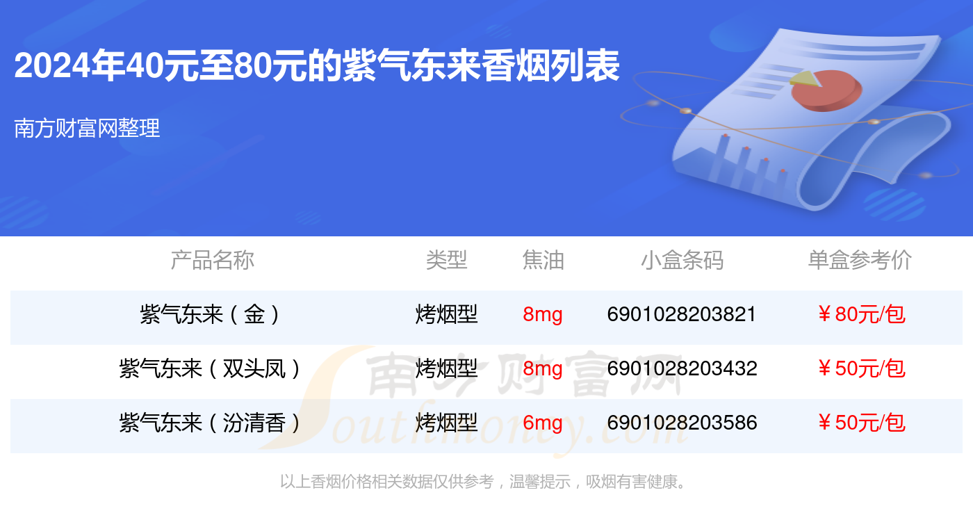 紫气东来(金)参考价80元/包、紫气东来(双头凤)参考价50.0元/包、紫气东来(汾清香)参考价50元/包等。