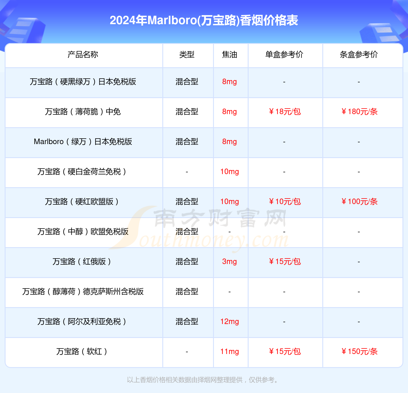 以上香烟价格相关数据由择烟网整理提供,仅供参考。