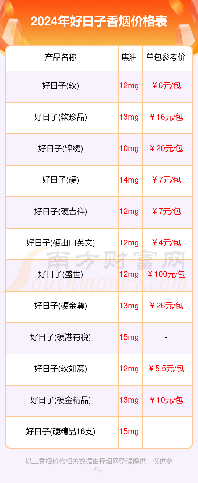 2024好日子香烟最新价格:好日子(盛世)参考价100.0元/包、好日子(硬金尊)参考价26.0元/包、好日子(锦绣)参考价20.0元/包、好日子(软珍品)参考价16.0元/包、好日子(硬金精品)参考价10.0元/包、好日子(硬吉祥)参考价7.0元/包。